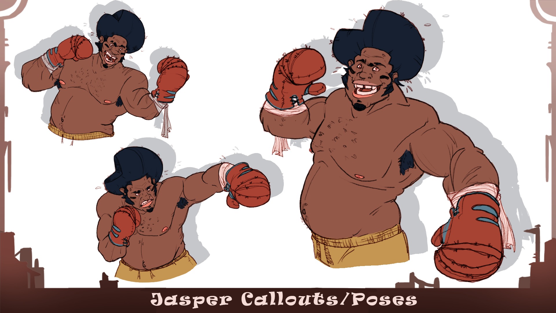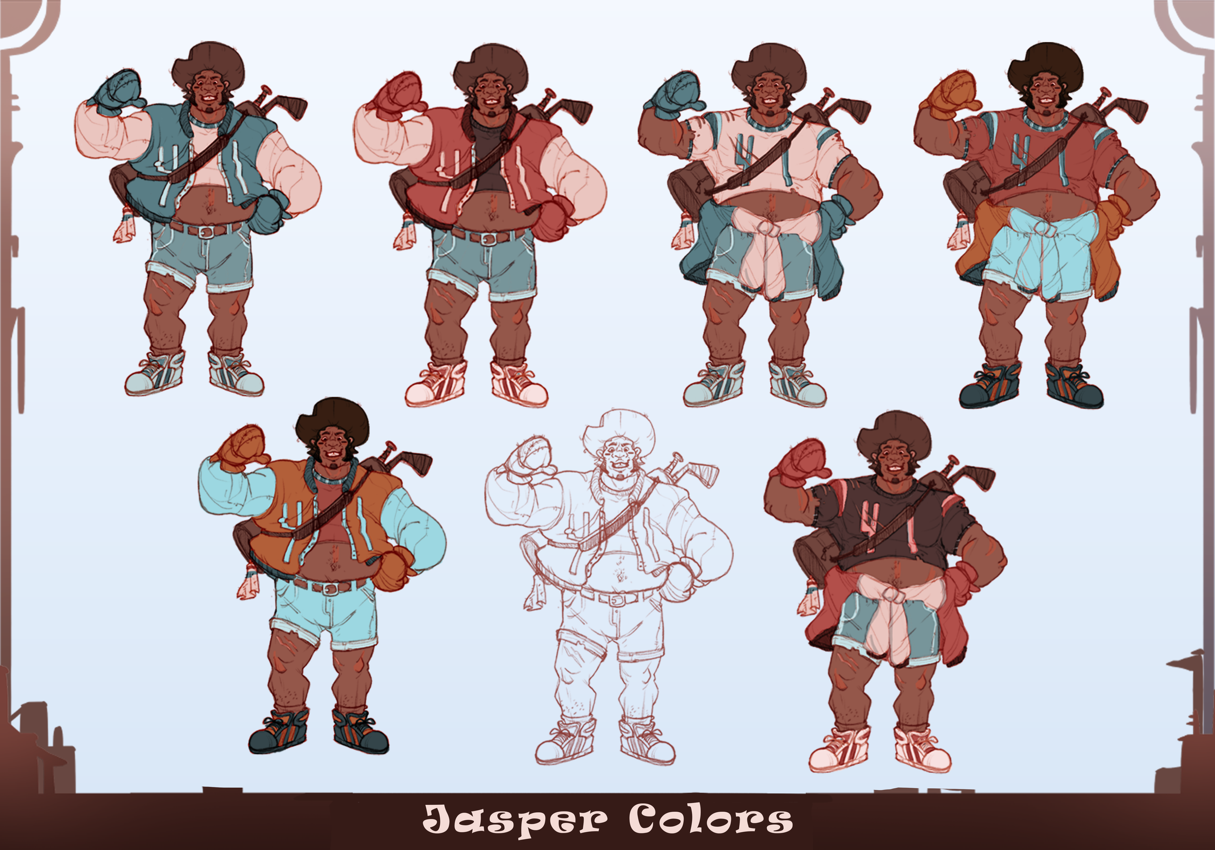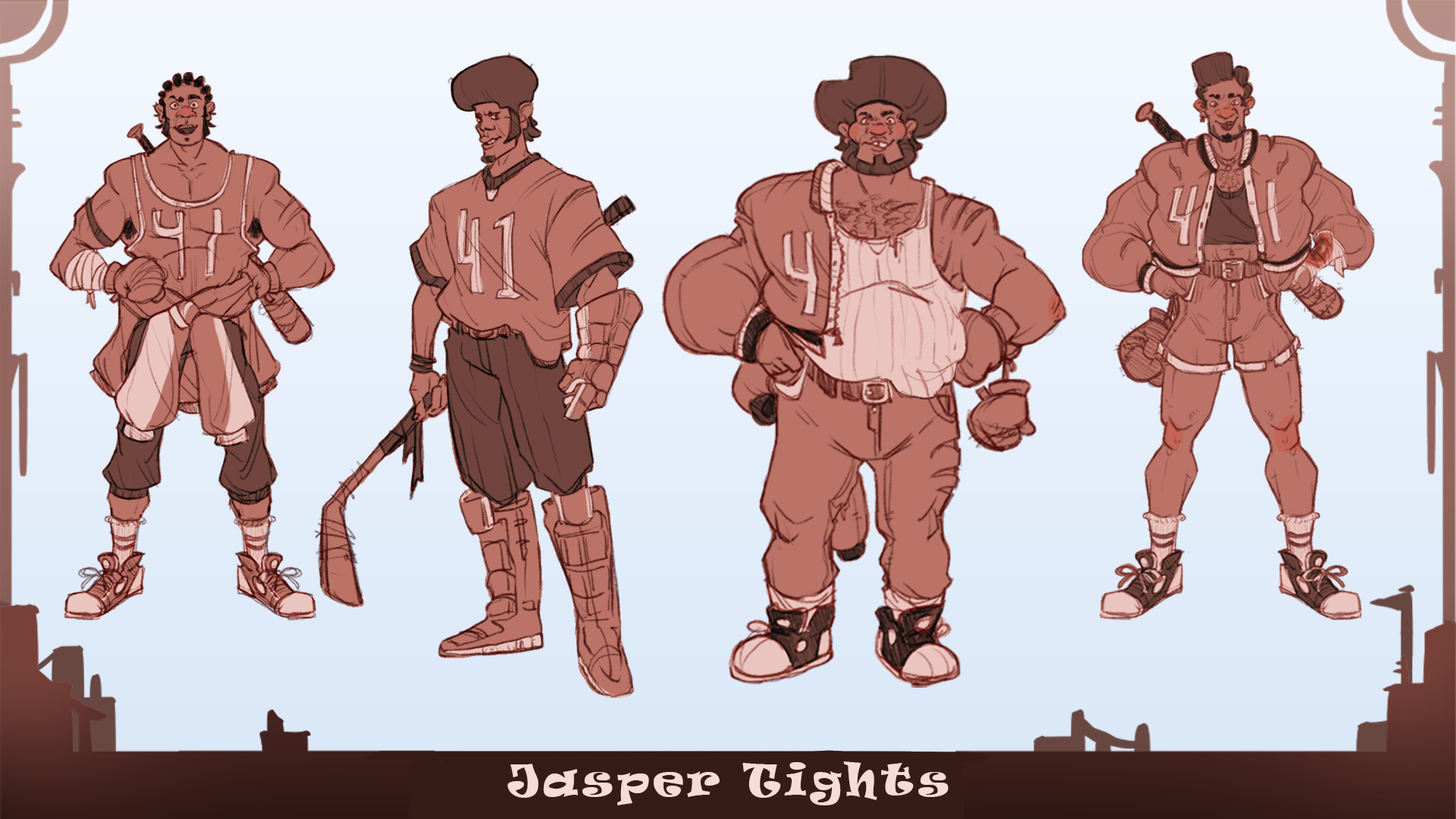 Jasper is a large, semi flamboyant, and outgoing older brother, while his Brawn certainly makes up for his brains, he is actually quite a charmer and a wordsmith with the power of being a social butterfly and the teams biggest and strongest member, and the defacto leader in most situations. I wanted to showcase a confident, large, and kind athlete of all kinds with his kit of weaponry, Boxing gloves, a Baseball bat and Hockey Sticks, perfect for a paranormal apocalypse.